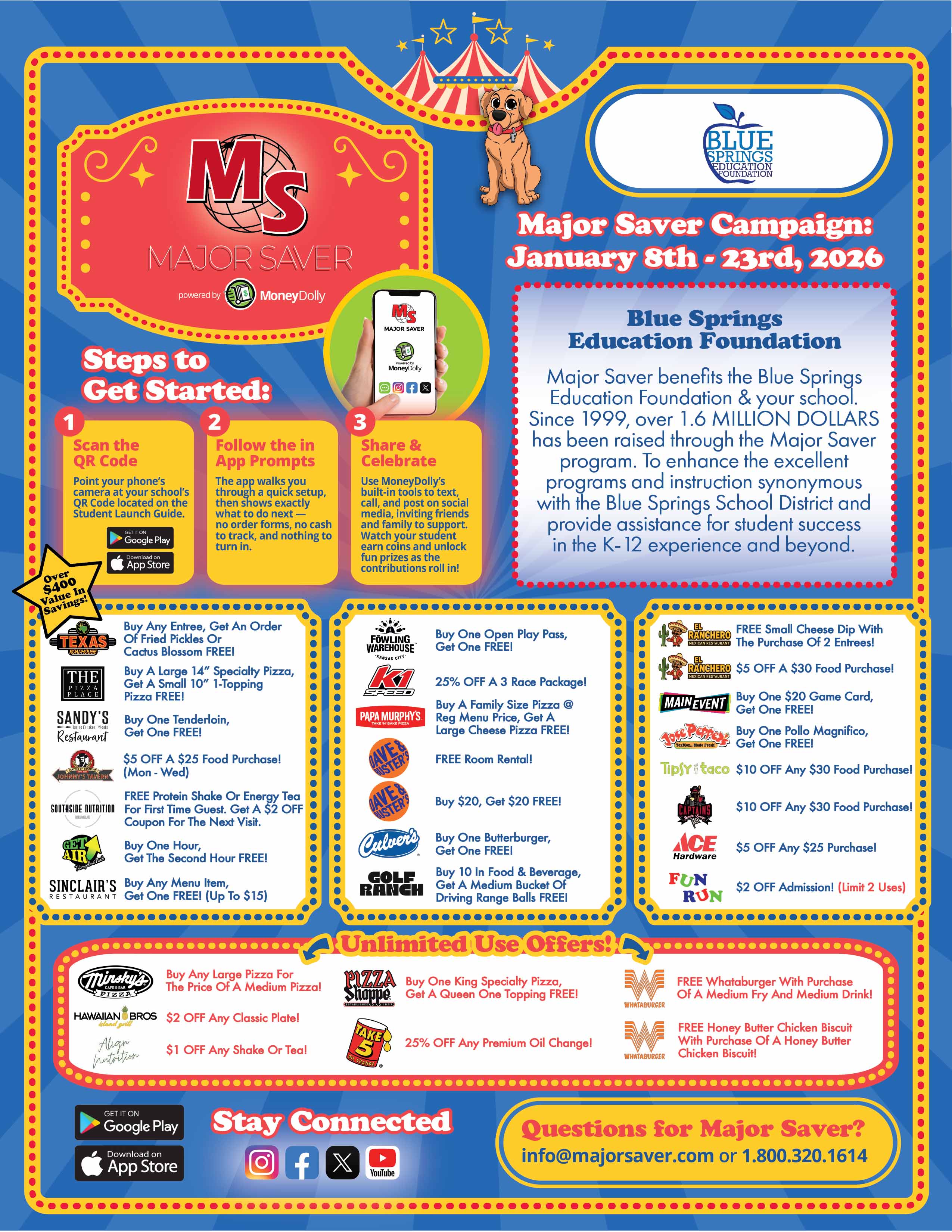 Please consider participating in the Major Saver campaign. Our students, school, and district will benefit from every card sold. Half of the money raised directly benefits William Bryant Elementary, and half benefits the Blue Springs Education Foundation. The Blue Springs Education Foundation supports district students, staff, and schools in various ways, such as classroom grants, scholarships, and assistance for students in need.